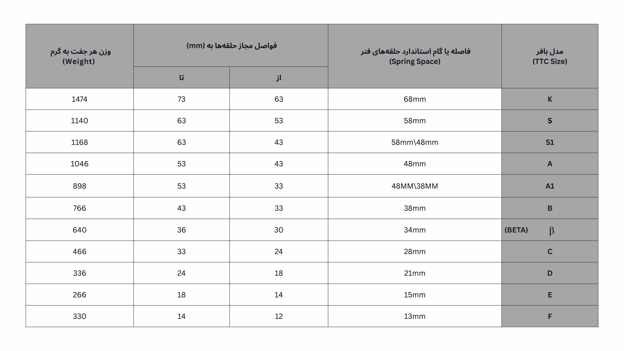 *سایزهای A1 و S1 برای فنرهایی مناسب هستند که حالت کلهقندی دارند؛ بهطوریکه در بخش پایین فنر، فاصله بین حلقهها بیشتر و در بخش بالایی، این فاصله کمتر است.